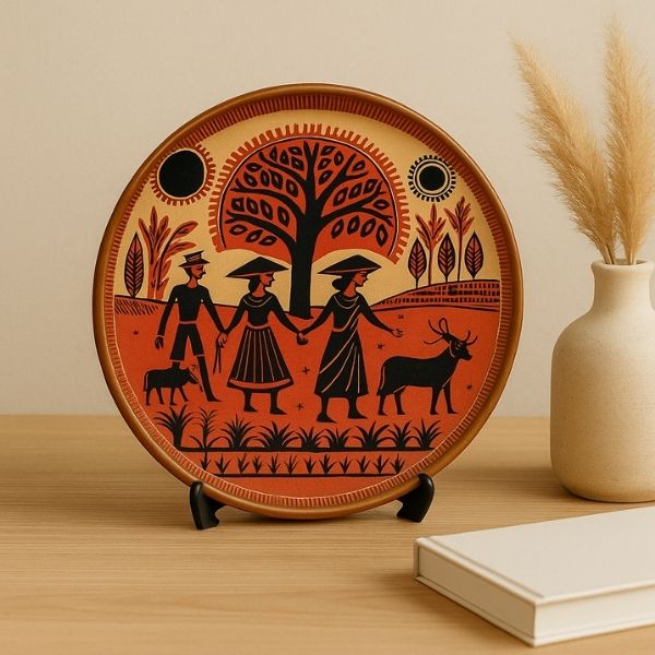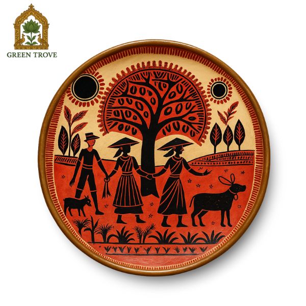 Celebrate the essence of India’s tribal heritage with this Customizable Warli Art Wall Plate, featuring a beautifully hand-painted village scene with farmers, animals, trees, and traditional patterns. Made on a round wooden base with an ornate decorative border, this wall plate reflects the timeless beauty of Warli folk art.